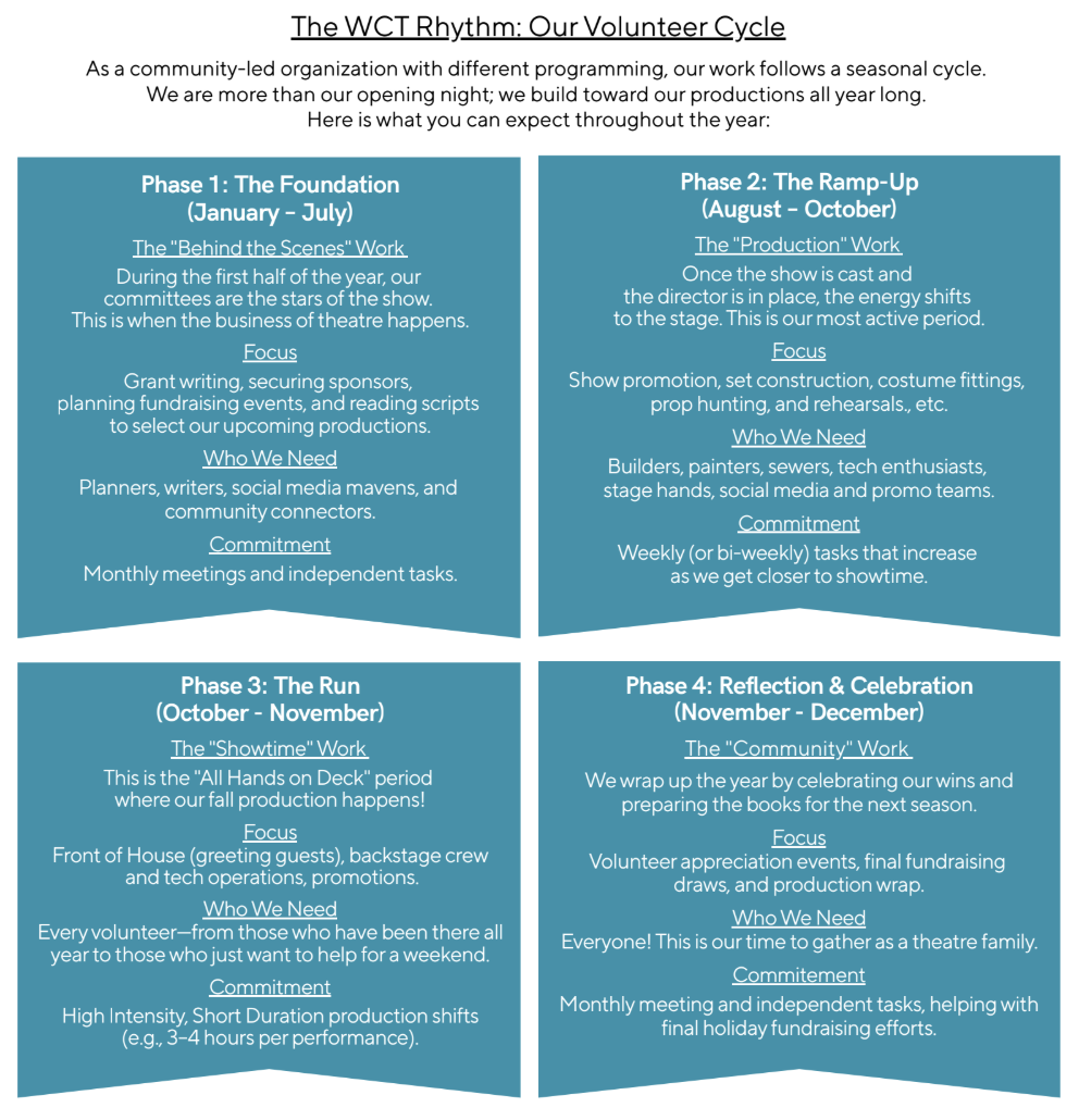 Wasaga Community Theatre thrives because of the passion, creativity, and the teamwork of our volunteers. Whether your strengths lie in organization, creativity, performance, or community connection, there is a committee where you can make a meaningful impact. Each committee is chaired by a member of our Board of Directors and welcomes volunteers who want to help bring live theatre to the community in Wasaga Beach.